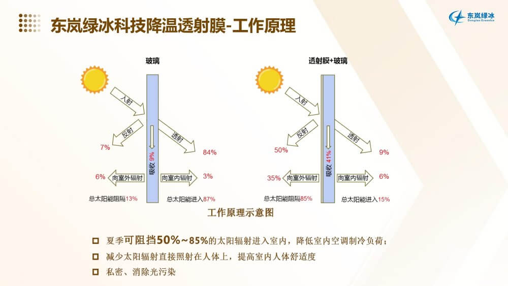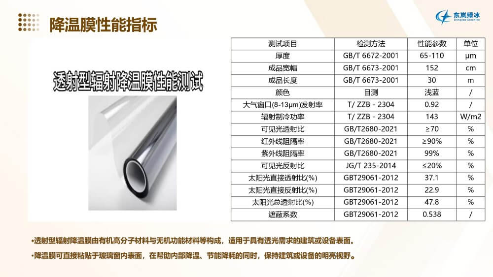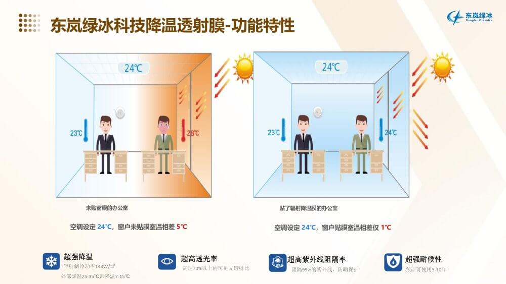 Achieve natural cooling for your spaces — cooler, more energy-efficient environments with our innovative architectural window film solution. Utilizing advanced carbon-free cooling coatings and spectral-selective technology, the film radiates excess solar heat through the atmospheric window (8–13 microns infrared band), efficiently channeling thermal energy into outer space and significantly reducing indoor temperatures.